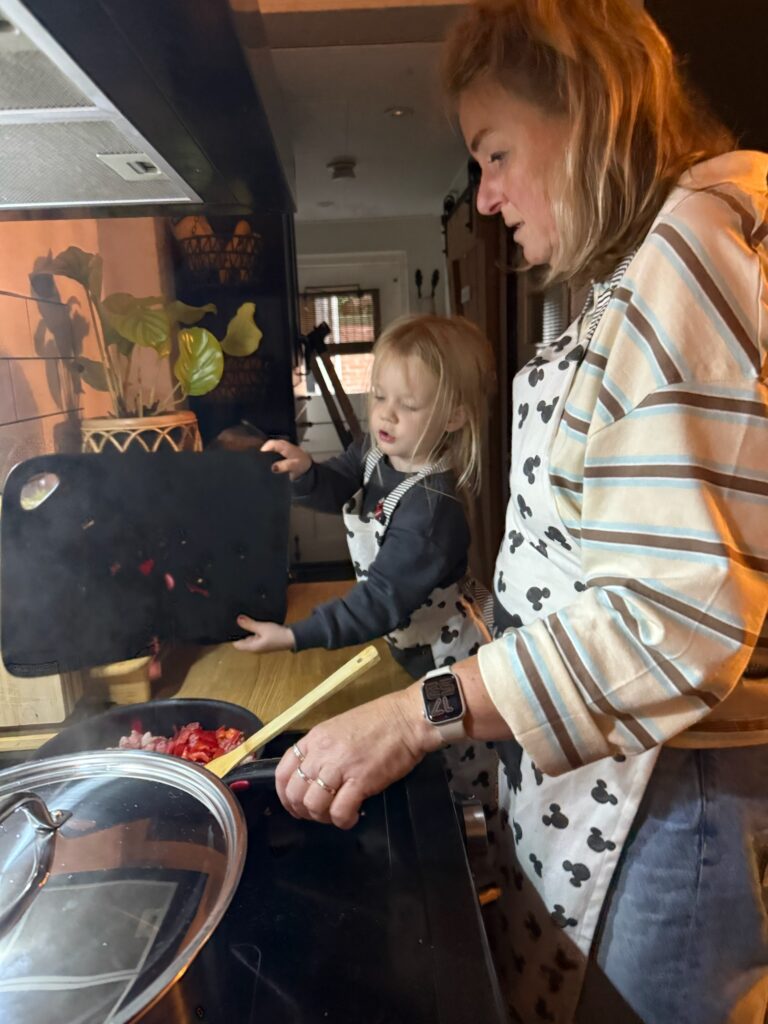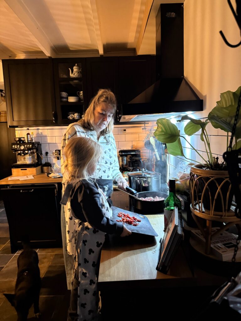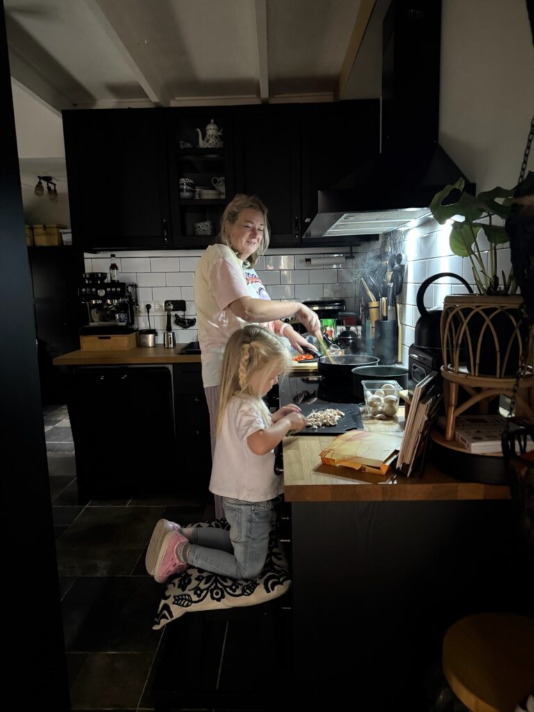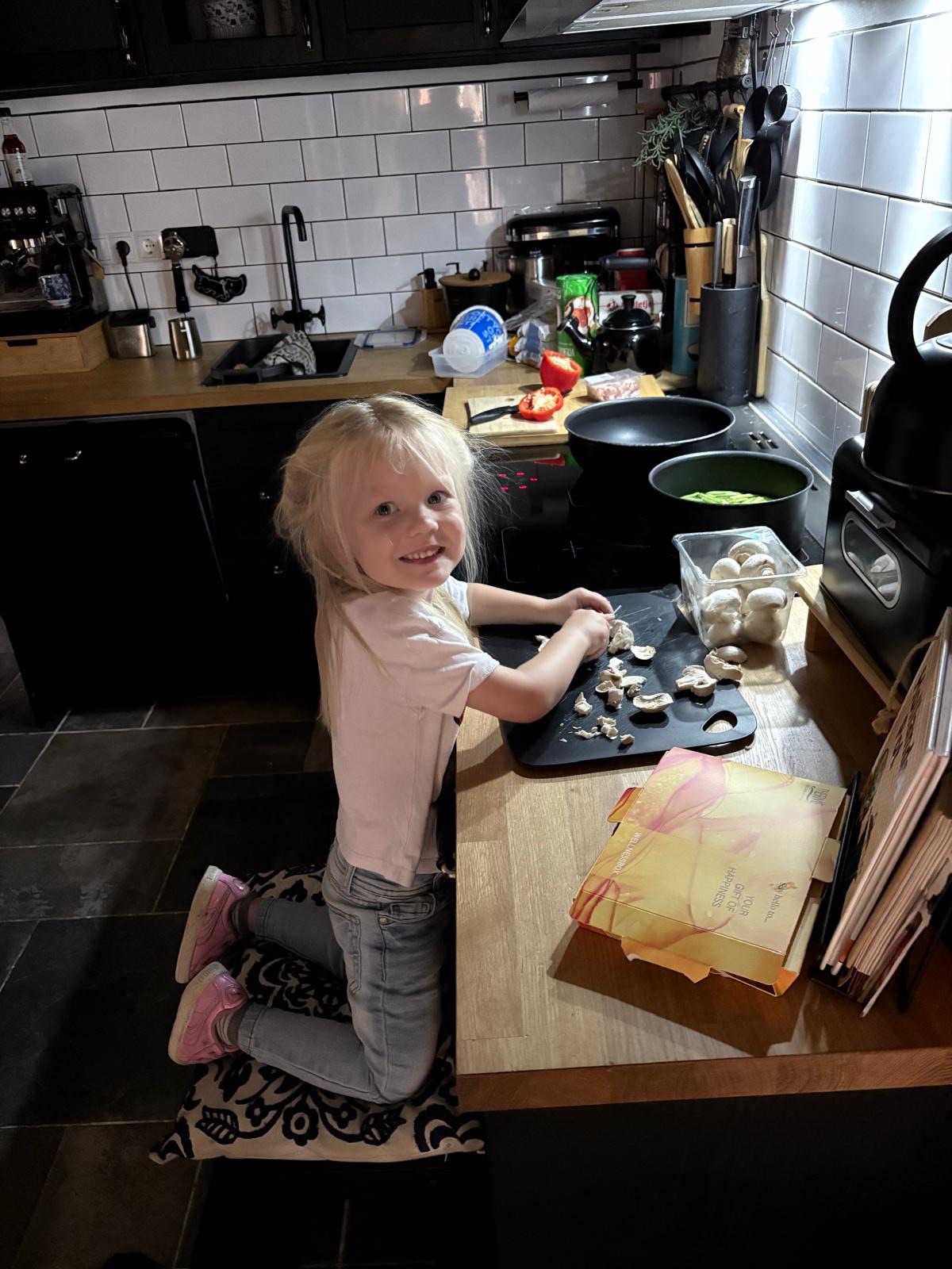 Myra helpt mee met koken.